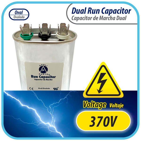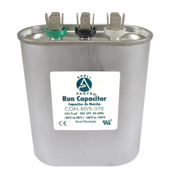 Appli Parts CON-60/5-370 Dual Run Capacitor for ac 60+5 Mfd uF (microfarads) 370VAC CBB65 Oval Universal fit for hvac and other applications 3-1/2in Wide 1-3/4in Depth 4-1/2in High