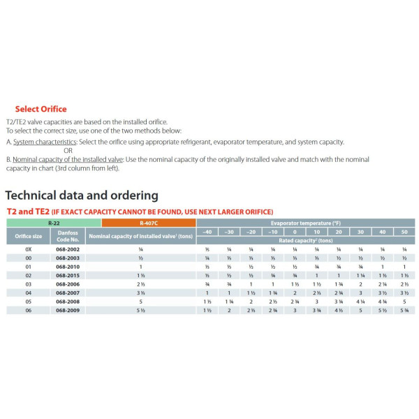 Danfoss 068Z3206 1/4 - 5.5TR Expansion Valve Body, T 2, R22,R407C, 3/8x1/2 in, Flare, Internal Equalized, Single-Flow, -40 to 50 F, Capacity determined by Orifice size Sold Separately, 068Z3466