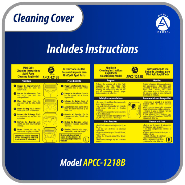 Appli Parts APCC-1218B Cleaning Cover Kit, Maintenance for Mini Split 1 - 1.5 Tons (up to 18,000 Btu) 2 ft 3 in to 3 ft 3 in length, 9 ft 2 in Drain Hose, with Support Plate and Box Packaging
