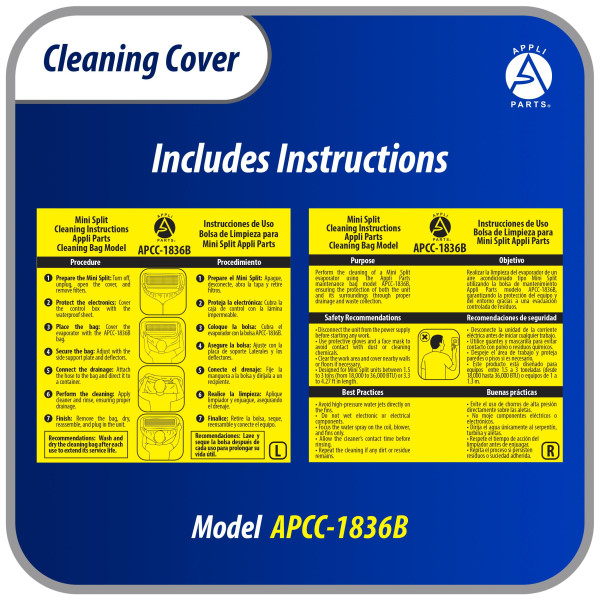 Appli Parts APCC-1836B Cleaning Cover Kit or Maintenance for Mini Split 1.5 - 3 Tons (from 18,000 to 36,000 Btu), 3 ft 3 in to 4 ft 3 in length, Waterproof, 9 ft 2 in Drain Hose, with Support Plate