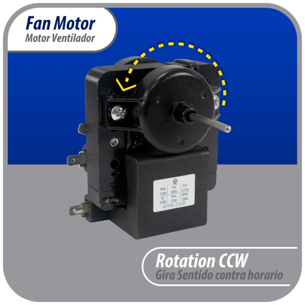 - Specs: Evaportator fan motor 110 Volts 60 Hertz 0.12 Amps 7.5 Watts 2,500 Rpm Counterclockwise rotation Shaft 1-1/16 inches long 1/8 inch diameter. Plastic housing protection