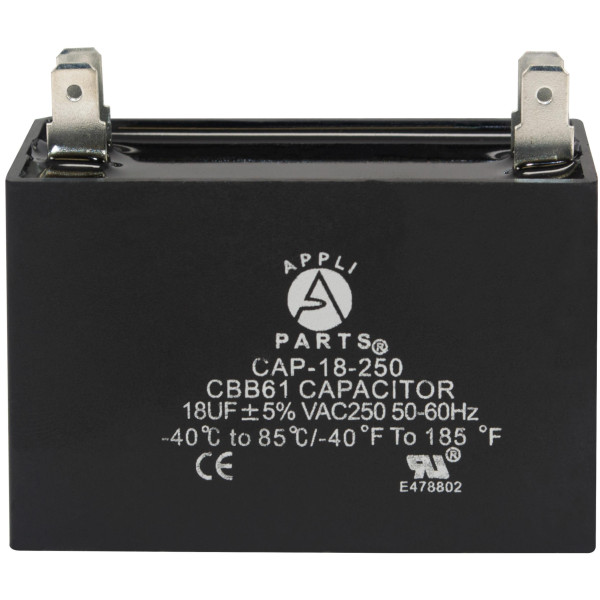 Appli Parts CAP-18-250 Fan Capacitor 18 mfd (microfarads) uf 250 VAC with 4 Terminal Connections compatible with any brand within the same range of capacitance 2-1/4 Width, 7/8 Depth, 1-7/8 in Height