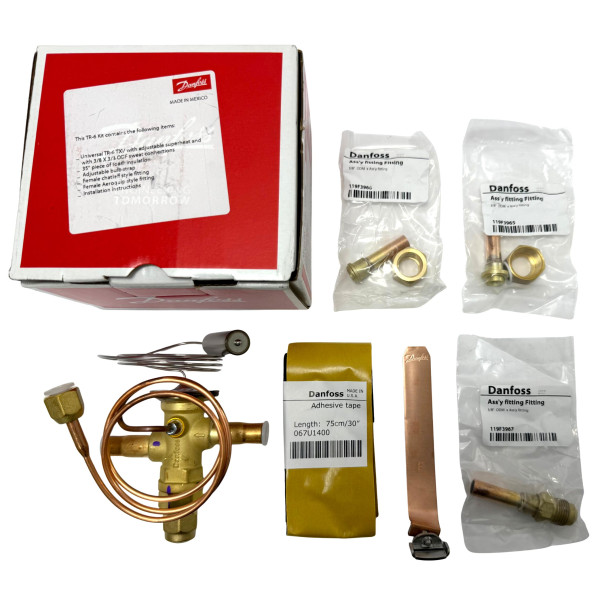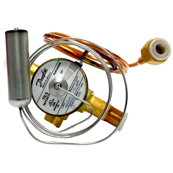 Danfoss 067L6010 7TR Thermostatic expansion valve, TR 6, R410A,R454B,R32 3/8x3/8 in Solder, ODF, 1/4 in Cap. Tube, Flare, Embossed 1-way arrow, 15 to 60 F