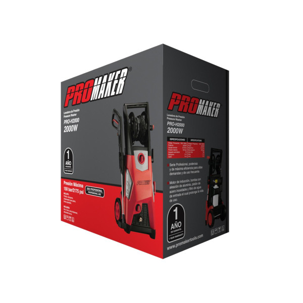 Promaker 2000W Presure Washer PRO-H2000 Voltage - Frequency: 120V - 60 Hz Amperage: 17.2AMP Power: 2000W Rated flow: 1.8 gal/min Max pressure: 2175 PSI Auto stop: Si Hose: 16.5ft Cord: 16.5ft
