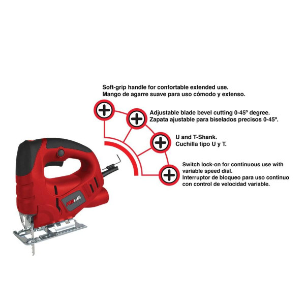 Promaker Jig Saw PRO-SC400 Voltage - Frequency: 120V - 60Hz Amperage: 3.5AMP Power: 400W Speed: 800-3000spm Bevel Cut: 0-45 Cutting capacity: 55mm (wood) 6mm (steel) Cord: 6.5ft