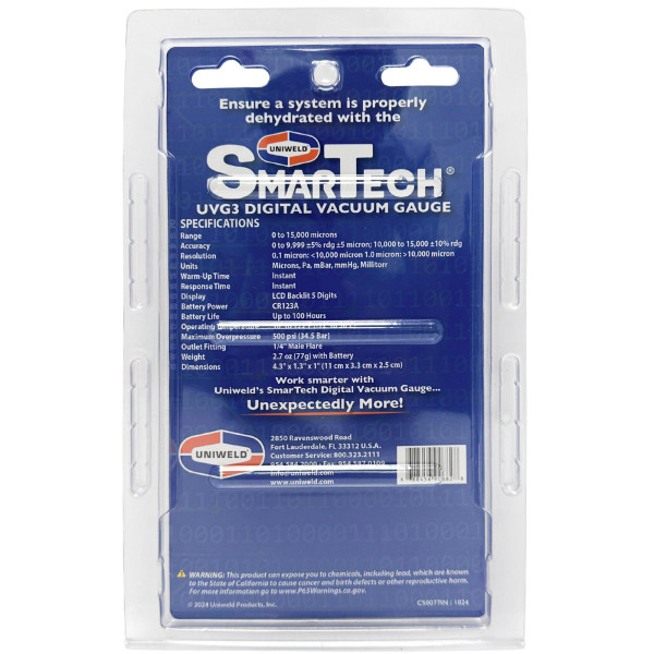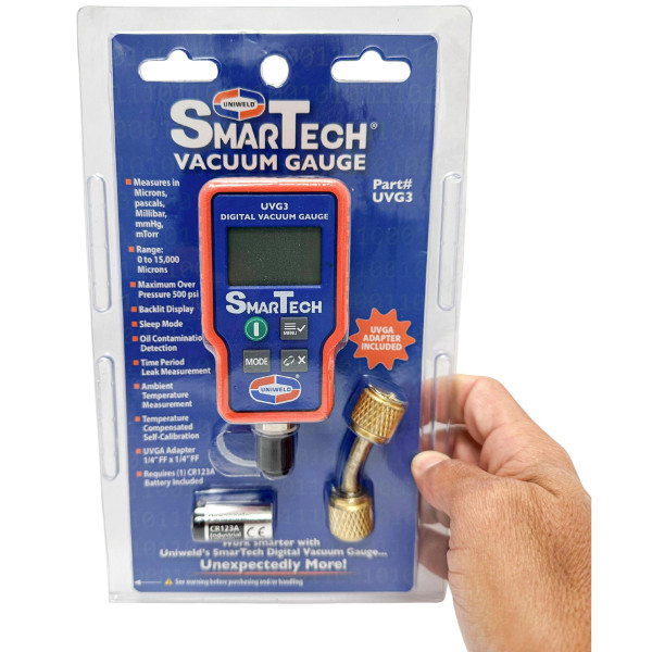Uniweld UVG3 Vacuometro Digital Smartech con Pantalla Iluminada, Rango 0-15000 Micrones Max presion 500psi, adaptador UVGA Incluido Requiere 1 CR132AA Bateria (incluida)