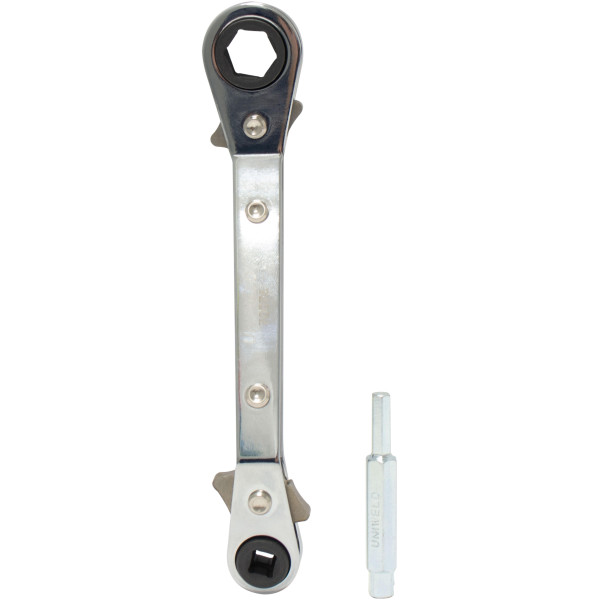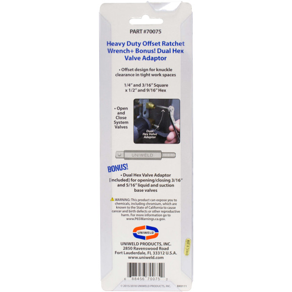 Uniweld 70075 Llave Ratchet, 1/2 y 9/16 pulg apertura exagonal, 3/16 y 1/4 pulg apertura cuadrada, con Adaptador Dual para Valvula exagonal de 3/16 y 5/16